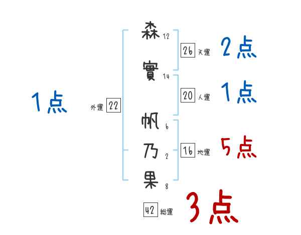 総運![]() | 森實帆乃果さんの総運は42画の3つ星!病気に注意。多芸であるが消極的でおとなしい。 あなたの人生を表す1番重要な運勢です。生涯を通じて影響する総合運となり、主に50歳以降の晩年期に影響を及ぼします。 |