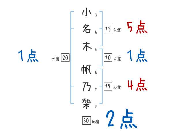 天運![]() | 小名木帆乃架さんの天運は13画の5つ星!才能に恵まれ人気がある。名声を手に入れる。円満な人生。 家系が持つ宿命的な運勢を表します。祖先から受け継いだ苗字ですので自分の力が及びません。家柄を象徴します。 |