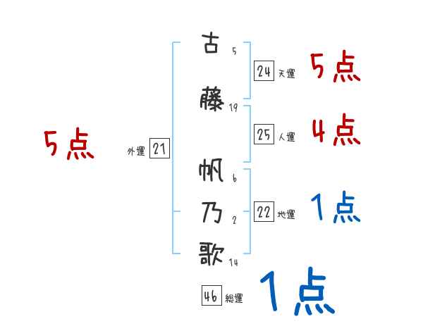 外運![]() | 古藤帆乃歌さんの外運は21画の5つ星!統率力がある。独立し成功する。名誉を手に入れる。 生活面を象徴する運勢です。外部から受ける影響力を表し、結婚運、家庭運や職場、環境への順応性を表します。 |