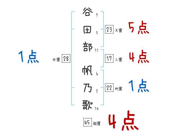 天運![]() | 谷田部帆乃歌さんの天運は23画の5つ星!想像力に優れ活力がある。一代で成功し名誉を手に入れる。 家系が持つ宿命的な運勢を表します。祖先から受け継いだ苗字ですので自分の力が及びません。家柄を象徴します。 |