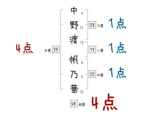 外運![]() | 中野渡帆乃華さんの外運は29画の4つ星!完全主義で才能がある。厳格な心の持ち主。 生活面を象徴する運勢です。外部から受ける影響力を表し、結婚運、家庭運や職場、環境への順応性を表します。 |