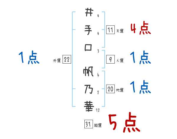外運![]() | 井手口帆乃華さんの外運は22画の1つ星!努力することが苦手ないっぽう手先が器用。芸術性にも優れる。 生活面を象徴する運勢です。外部から受ける影響力を表し、結婚運、家庭運や職場、環境への順応性を表します。 |