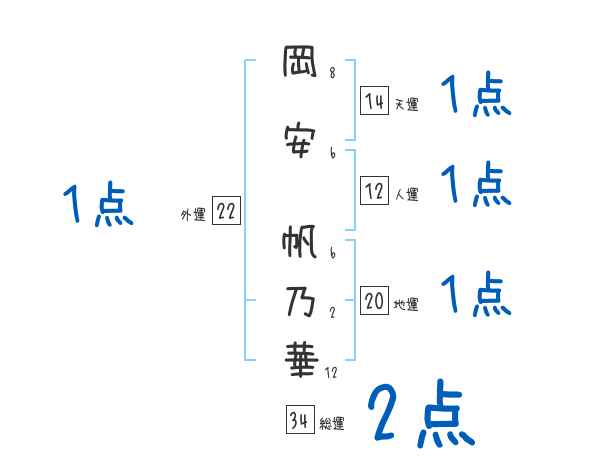 | 総運  | 岡安帆乃華さんの総運は34画の2つ星!独創性に優れるが、自尊心が強く災難に注意しましょう。あなたの人生を表す1番重要な運勢です。生涯を通じて影響する総合運となり、主に50歳以降の晩年期に影響を及ぼします。 |
