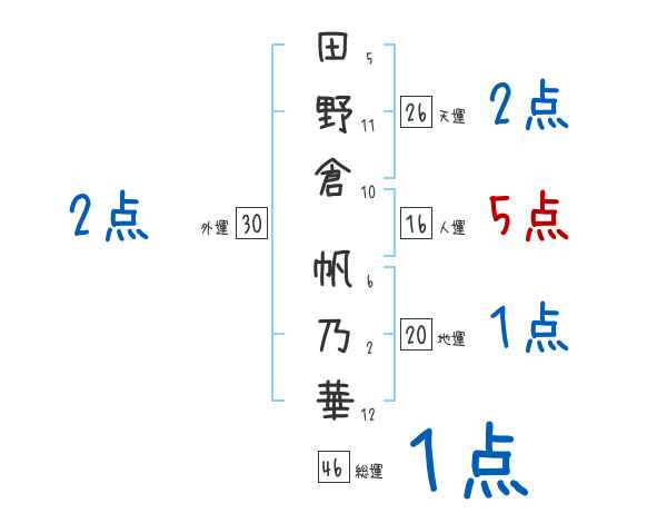 天運![]() | 田野倉帆乃華さんの天運は26画の2つ星!波瀾万丈かも。信頼できる人を大事にしましょう。 家系が持つ宿命的な運勢を表します。祖先から受け継いだ苗字ですので自分の力が及びません。家柄を象徴します。 |