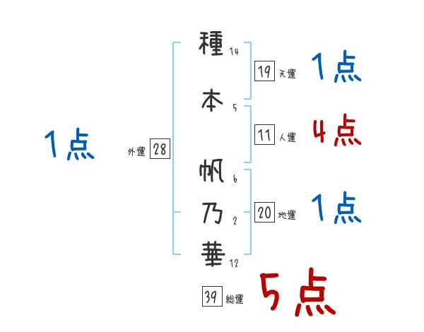 総運![]() | 種本帆乃華さんの総運は39画の5つ星!社交性に優れ人望が厚い。人の上に立ち成功する。 あなたの人生を表す1番重要な運勢です。生涯を通じて影響する総合運となり、主に50歳以降の晩年期に影響を及ぼします。 |