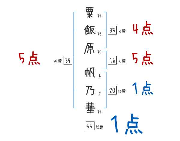 外運![]() | 粟飯原帆乃華さんの外運は39画の5つ星!社交性に優れ人望が厚い。人の上に立ち成功する。 生活面を象徴する運勢です。外部から受ける影響力を表し、結婚運、家庭運や職場、環境への順応性を表します。 |
