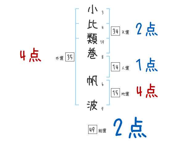 外運![]() | 小比類巻帆波さんの外運は35画の4つ星!温厚な性格で感受性が高い。穏和な性格で人望が厚い。 生活面を象徴する運勢です。外部から受ける影響力を表し、結婚運、家庭運や職場、環境への順応性を表します。 |