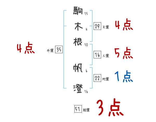 外運![]() | 駒木根帆澄さんの外運は35画の4つ星!温厚な性格で感受性が高い。穏和な性格で人望が厚い。 生活面を象徴する運勢です。外部から受ける影響力を表し、結婚運、家庭運や職場、環境への順応性を表します。 |