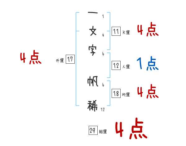 外運![]() | 一文字帆稀さんの外運は17画の4つ星!積極的な行動力。地位を気づき財産を手に入れる。純粋な心と直感力。 生活面を象徴する運勢です。外部から受ける影響力を表し、結婚運、家庭運や職場、環境への順応性を表します。 |