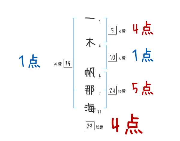 天運![]() | 一木帆那海さんの天運は5画の4つ星!健康で安泰。協調性に優れ、財産に恵まれる。 家系が持つ宿命的な運勢を表します。祖先から受け継いだ苗字ですので自分の力が及びません。家柄を象徴します。 |