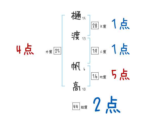 総運![]() | 樋渡帆高さんの総運は44画の2つ星!誠実で慎重な性格。物事を考えすぎないように注意しましょう。 あなたの人生を表す1番重要な運勢です。生涯を通じて影響する総合運となり、主に50歳以降の晩年期に影響を及ぼします。 |