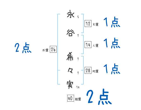 天運![]() | 永谷希々実さんの天運は12画の1つ星!簡単な失敗で諦めてしまいやすいかも。着実に行動すると良いでしょう。 家系が持つ宿命的な運勢を表します。祖先から受け継いだ苗字ですので自分の力が及びません。家柄を象徴します。 |