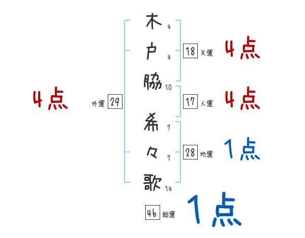 天運![]() | 木戸脇希々歌さんの天運は18画の4つ星!情熱的で剛気。忍耐力があり信頼される。 家系が持つ宿命的な運勢を表します。祖先から受け継いだ苗字ですので自分の力が及びません。家柄を象徴します。 |
