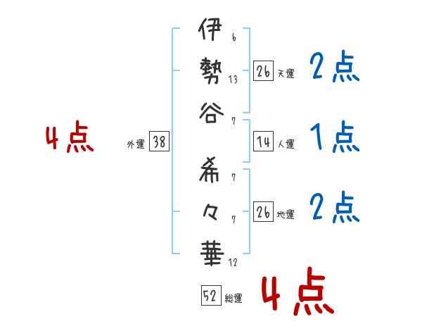 天運![]() | 伊勢谷希々華さんの天運は26画の2つ星!波瀾万丈かも。信頼できる人を大事にしましょう。 家系が持つ宿命的な運勢を表します。祖先から受け継いだ苗字ですので自分の力が及びません。家柄を象徴します。 |