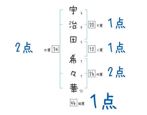 総運![]() | 宇治田希々華さんの総運は46画の1つ星!迷走することが多く苦労するかも。目先のことにとらわれないように。 あなたの人生を表す1番重要な運勢です。生涯を通じて影響する総合運となり、主に50歳以降の晩年期に影響を及ぼします。 |