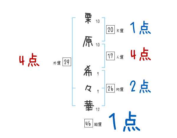 外運![]() | 栗原希々華さんの外運は29画の4つ星!完全主義で才能がある。厳格な心の持ち主。 生活面を象徴する運勢です。外部から受ける影響力を表し、結婚運、家庭運や職場、環境への順応性を表します。 |