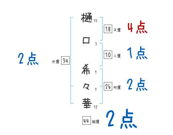 天運![]() | 樋口希々華さんの天運は18画の4つ星!情熱的で剛気。忍耐力があり信頼される。 家系が持つ宿命的な運勢を表します。祖先から受け継いだ苗字ですので自分の力が及びません。家柄を象徴します。 |