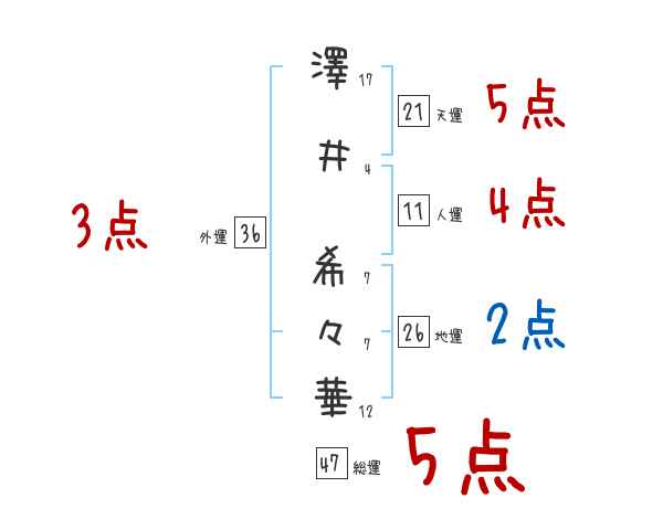 総運![]() | 澤井希々華さんの総運は47画の5つ星!実力が開花し発展する円満な人生。財に恵まれる。 あなたの人生を表す1番重要な運勢です。生涯を通じて影響する総合運となり、主に50歳以降の晩年期に影響を及ぼします。 |