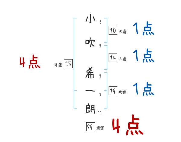 外運![]() | 小吹希一朗さんの外運は15画の4つ星!人徳があり出世する。順調に物事を進め円満な人生。 生活面を象徴する運勢です。外部から受ける影響力を表し、結婚運、家庭運や職場、環境への順応性を表します。 |