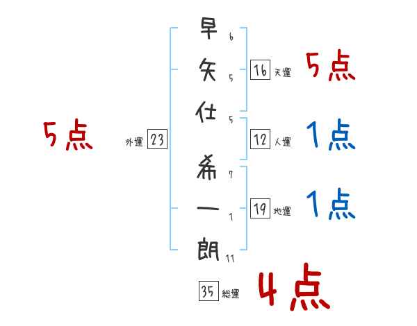 外運![]() | 早矢仕希一朗さんの外運は23画の5つ星!想像力に優れ活力がある。一代で成功し名誉を手に入れる。 生活面を象徴する運勢です。外部から受ける影響力を表し、結婚運、家庭運や職場、環境への順応性を表します。 |