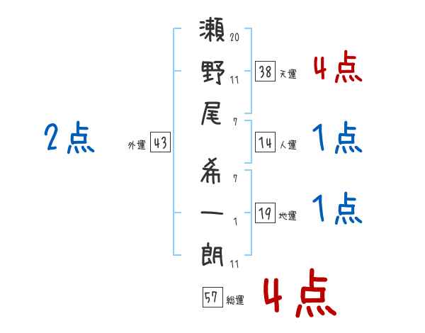 総運![]() | 瀬野尾希一朗さんの総運は57画の4つ星!向上心があり人望がある。地位を得る。 あなたの人生を表す1番重要な運勢です。生涯を通じて影響する総合運となり、主に50歳以降の晩年期に影響を及ぼします。 |