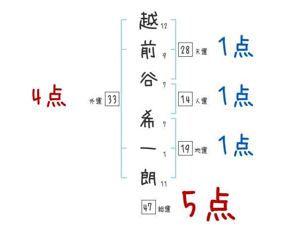 天運![]() | 越前谷希一朗さんの天運は28画の1つ星!家庭環境に注意。スポーツで活躍できる能力があるかも。 家系が持つ宿命的な運勢を表します。祖先から受け継いだ苗字ですので自分の力が及びません。家柄を象徴します。 |