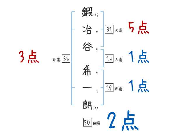 天運![]() | 鍛冶谷希一朗さんの天運は31画の5つ星!社交性があり判断力に優れる。順風満帆な人生で円満な生活。 家系が持つ宿命的な運勢を表します。祖先から受け継いだ苗字ですので自分の力が及びません。家柄を象徴します。 |