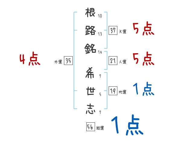 外運![]() | 根路銘希世志さんの外運は35画の4つ星!温厚な性格で感受性が高い。穏和な性格で人望が厚い。 生活面を象徴する運勢です。外部から受ける影響力を表し、結婚運、家庭運や職場、環境への順応性を表します。 |