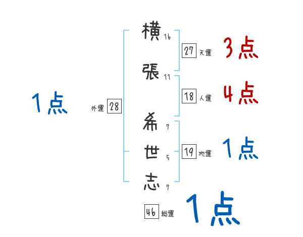 天運![]() | 横張希世志さんの天運は27画の3つ星!頭脳明晰だが強情で摩擦が多い傾向。孤立に注意。 家系が持つ宿命的な運勢を表します。祖先から受け継いだ苗字ですので自分の力が及びません。家柄を象徴します。 |