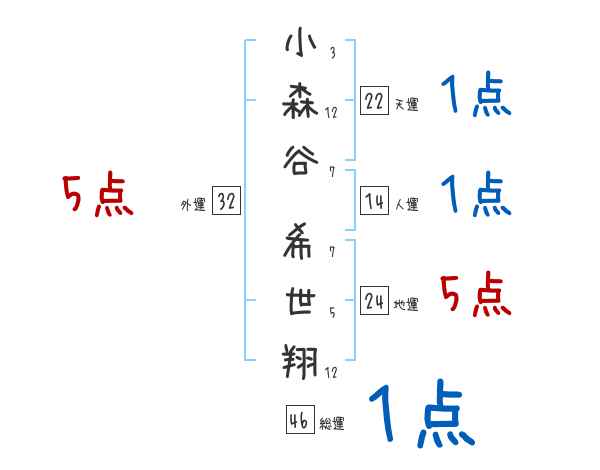 外運![]() | 小森谷希世翔さんの外運は32画の5つ星!柔軟性があり成功する。チャンスが多く金運が良い。 生活面を象徴する運勢です。外部から受ける影響力を表し、結婚運、家庭運や職場、環境への順応性を表します。 |