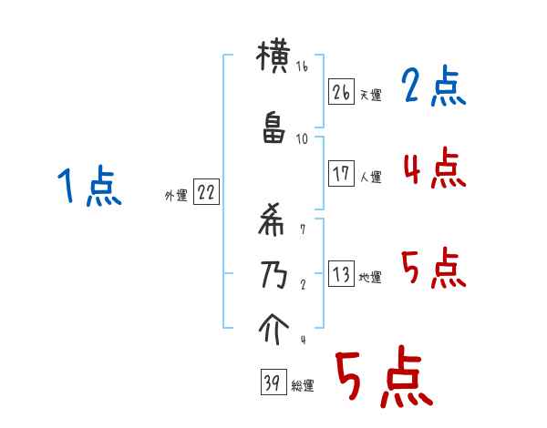 総運![]() | 横畠希乃介さんの総運は39画の5つ星!社交性に優れ人望が厚い。人の上に立ち成功する。 あなたの人生を表す1番重要な運勢です。生涯を通じて影響する総合運となり、主に50歳以降の晩年期に影響を及ぼします。 |