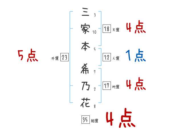 総運![]() | 三家本希乃花さんの総運は35画の4つ星!温厚な性格で感受性が高い。穏和な性格で人望が厚い。 あなたの人生を表す1番重要な運勢です。生涯を通じて影響する総合運となり、主に50歳以降の晩年期に影響を及ぼします。 |