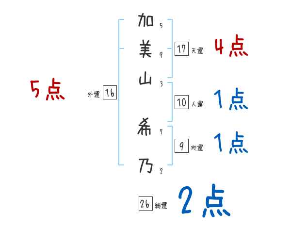 外運![]() | 加美山希乃さんの外運は16画の5つ星!人望が厚く大きく発展する。逆転成功が見える。 生活面を象徴する運勢です。外部から受ける影響力を表し、結婚運、家庭運や職場、環境への順応性を表します。 |
