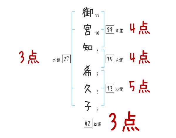 総運![]() | 御宮知希久子さんの総運は42画の3つ星!病気に注意。多芸であるが消極的でおとなしい。 あなたの人生を表す1番重要な運勢です。生涯を通じて影響する総合運となり、主に50歳以降の晩年期に影響を及ぼします。 |