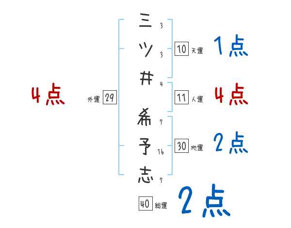 天運![]() | 三ツ井希予志さんの天運は10画の1つ星!不安を感じやすい傾向。ストレスを抱えないように注意しましょう。 家系が持つ宿命的な運勢を表します。祖先から受け継いだ苗字ですので自分の力が及びません。家柄を象徴します。 |