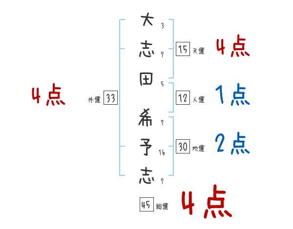 総運![]() | 大志田希予志さんの総運は45画の4つ星!もくもくと物事を進め達成する。地味な努力家。 あなたの人生を表す1番重要な運勢です。生涯を通じて影響する総合運となり、主に50歳以降の晩年期に影響を及ぼします。 |