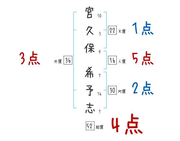 人運![]() | 宮久保希予志さんの人運は16画の5つ星!人望が厚く大きく発展する。逆転成功が見える。 性格や才能などを表す2番目に重要な運勢です。人間関係や協調性、社会的な成功に影響します。主に20歳から50歳ぐらいまでの中年期の運勢を表します。 |