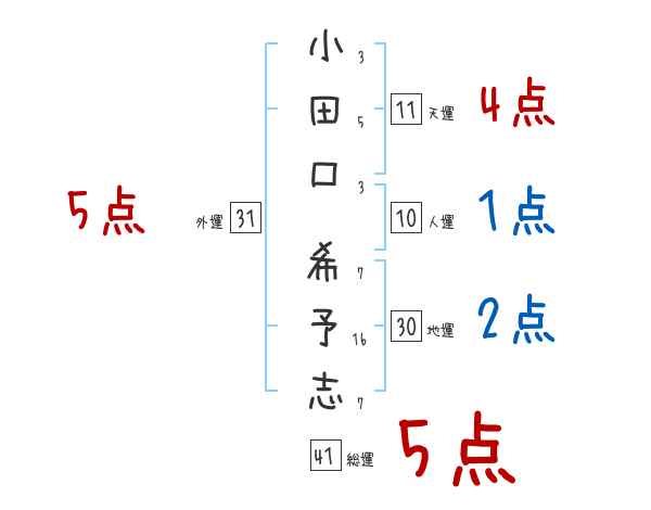 天運![]() | 小田口希予志さんの天運は11画の4つ星!着実に富や地位を得る幸運な人生。 家系が持つ宿命的な運勢を表します。祖先から受け継いだ苗字ですので自分の力が及びません。家柄を象徴します。 |