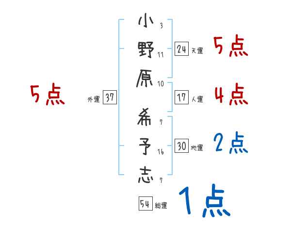 外運![]() | 小野原希予志さんの外運は37画の5つ星!努力家で順応性に優れる。現実的な考え方ができ忠実に物事をこなす。 生活面を象徴する運勢です。外部から受ける影響力を表し、結婚運、家庭運や職場、環境への順応性を表します。 |