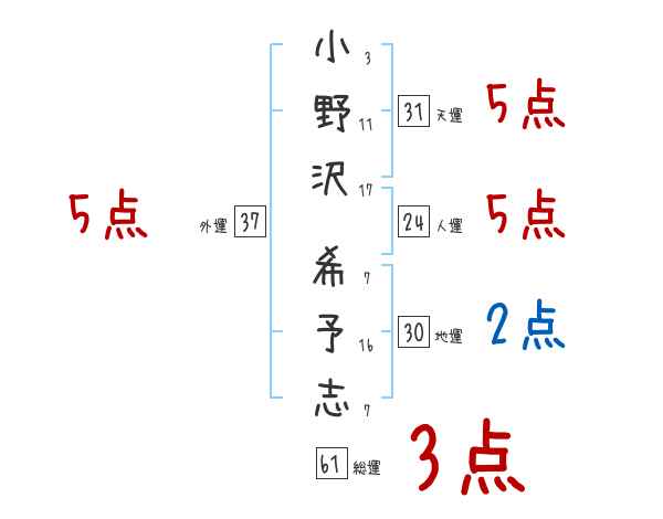 総運![]() | 小野沢希予志さんの総運は61画の3つ星!強情な性格でうぬぼれタイプ。自ら破滅する。 あなたの人生を表す1番重要な運勢です。生涯を通じて影響する総合運となり、主に50歳以降の晩年期に影響を及ぼします。 |