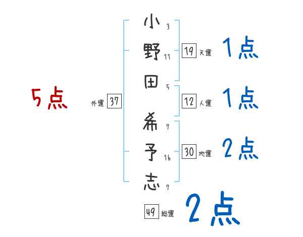 天運![]() | 小野田希予志さんの天運は19画の1つ星!優れた才能を持ちますが、協調性が足りないことも。周りの人と協力する事を意識しましょう。 家系が持つ宿命的な運勢を表します。祖先から受け継いだ苗字ですので自分の力が及びません。家柄を象徴します。 |