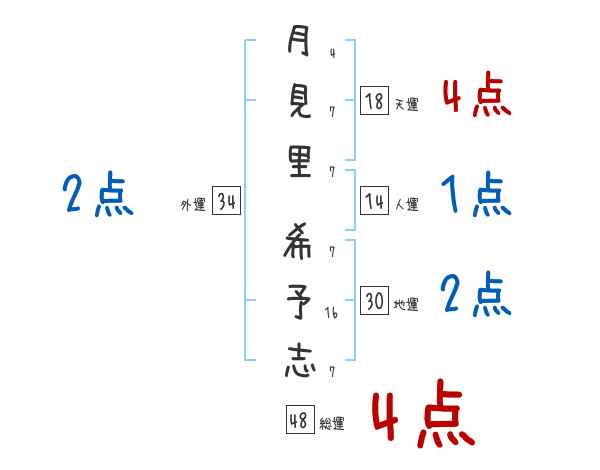 天運![]() | 月見里希予志さんの天運は18画の4つ星!情熱的で剛気。忍耐力があり信頼される。 家系が持つ宿命的な運勢を表します。祖先から受け継いだ苗字ですので自分の力が及びません。家柄を象徴します。 |