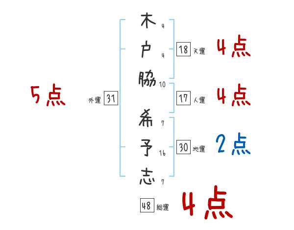 天運![]() | 木戸脇希予志さんの天運は18画の4つ星!情熱的で剛気。忍耐力があり信頼される。 家系が持つ宿命的な運勢を表します。祖先から受け継いだ苗字ですので自分の力が及びません。家柄を象徴します。 |