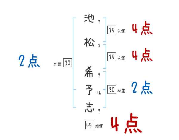 | 天運  | 池松希予志さんの天運は15画の4つ星!人徳があり出世する。順調に物事を進め円満な人生。家系が持つ宿命的な運勢を表します。祖先から受け継いだ苗字ですので自分の力が及びません。家柄を象徴します。 |