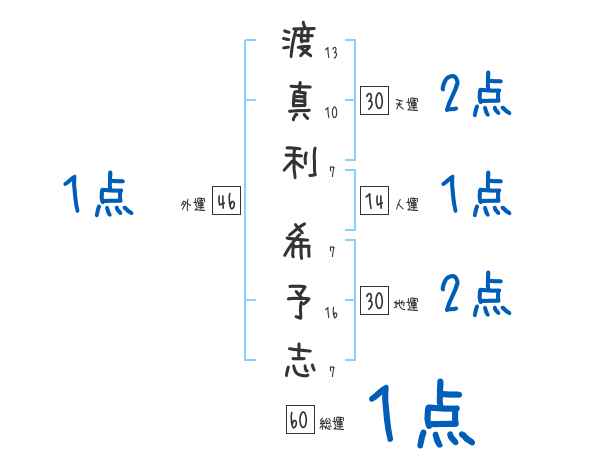 天運![]() | 渡真利希予志さんの天運は30画の2つ星!浮き沈みの激しさに注意しましょう。 家系が持つ宿命的な運勢を表します。祖先から受け継いだ苗字ですので自分の力が及びません。家柄を象徴します。 |
