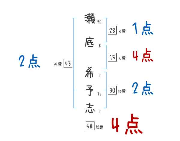 総運![]() | 瀬底希予志さんの総運は58画の4つ星!安定した生活。大器晩成タイプ。 あなたの人生を表す1番重要な運勢です。生涯を通じて影響する総合運となり、主に50歳以降の晩年期に影響を及ぼします。 |