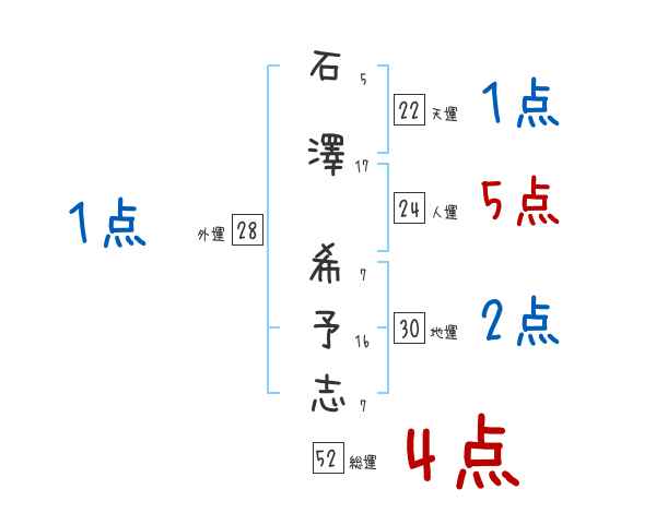 外運![]() | 石澤希予志さんの外運は28画の1つ星!家庭環境に注意。スポーツで活躍できる能力があるかも。 生活面を象徴する運勢です。外部から受ける影響力を表し、結婚運、家庭運や職場、環境への順応性を表します。 |