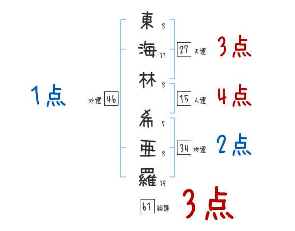 天運![]() | 東海林希亜羅さんの天運は27画の3つ星!頭脳明晰だが強情で摩擦が多い傾向。孤立に注意。 家系が持つ宿命的な運勢を表します。祖先から受け継いだ苗字ですので自分の力が及びません。家柄を象徴します。 |