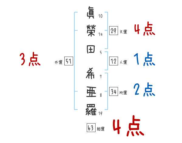 天運![]() | 眞榮田希亜羅さんの天運は29画の4つ星!完全主義で才能がある。厳格な心の持ち主。 家系が持つ宿命的な運勢を表します。祖先から受け継いだ苗字ですので自分の力が及びません。家柄を象徴します。 |