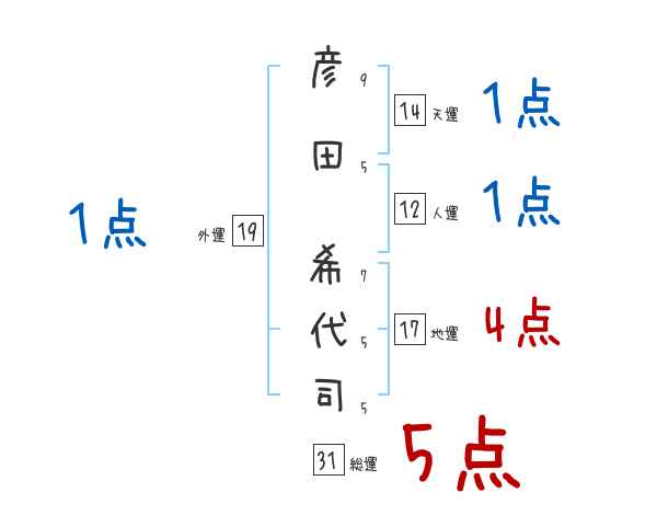 外運![]() | 彦田希代司さんの外運は19画の1つ星!優れた才能を持ちますが、協調性が足りないことも。周りの人と協力する事を意識しましょう。 生活面を象徴する運勢です。外部から受ける影響力を表し、結婚運、家庭運や職場、環境への順応性を表します。 |